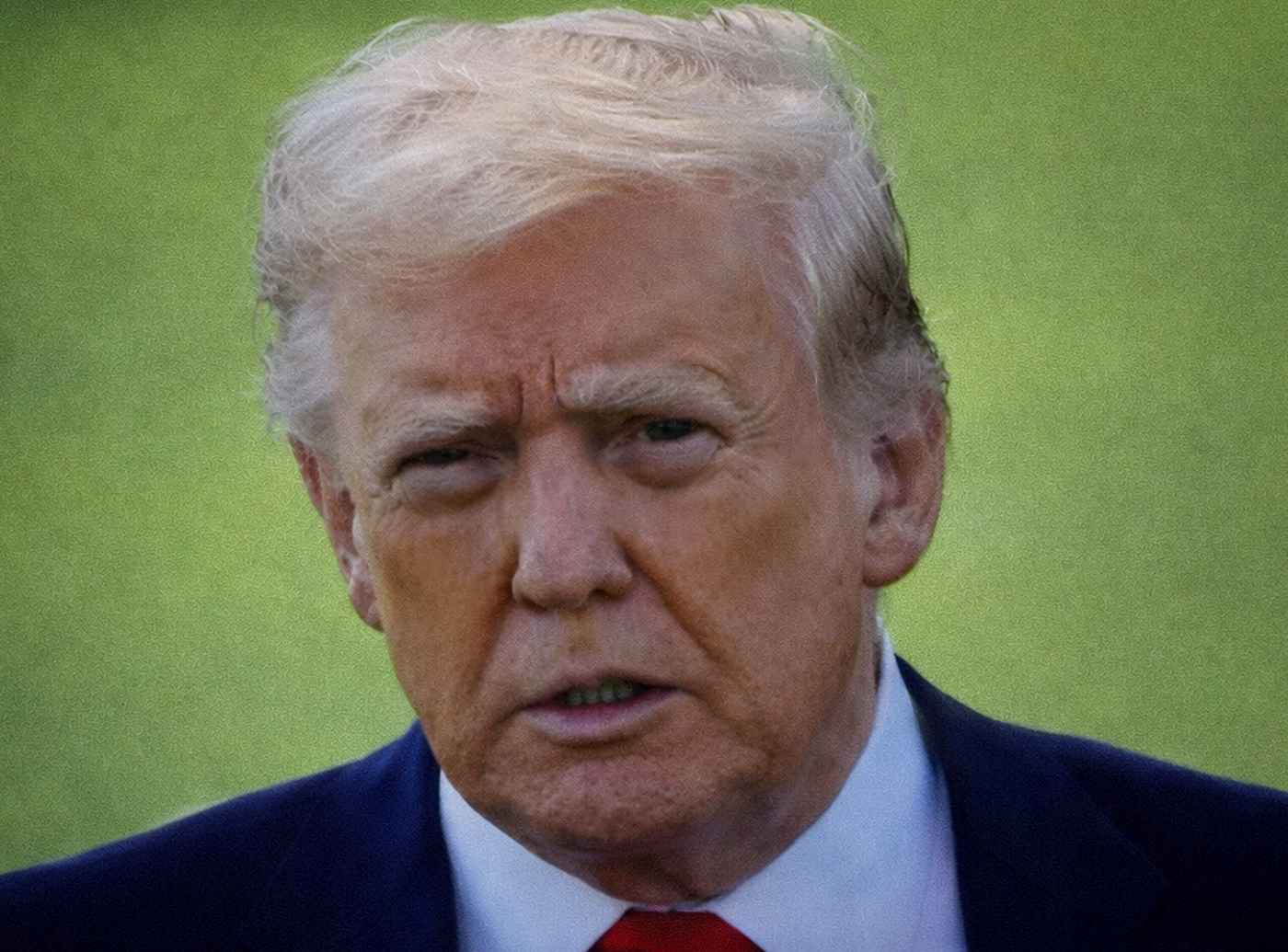 Close-up of a man with blond hair wearing a dark suit and red tie against a green